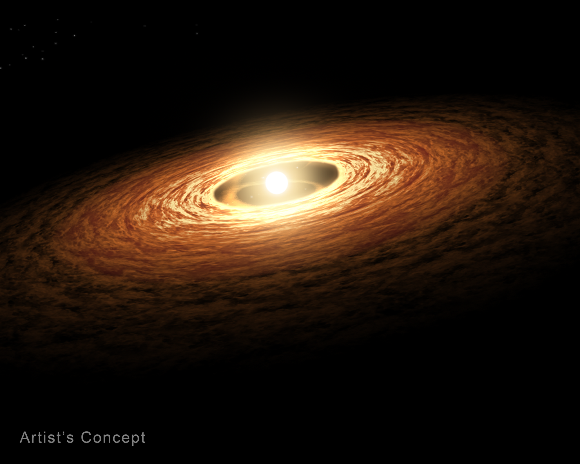 Denne kunstneriske fremstillingen viser en ung stjerne med sin protoplanetariske skive. Det er i slike skiver planeter dannes.