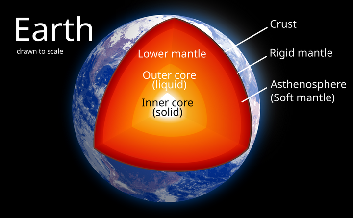 Jordens indre struktur med en jernkjerne i midten. Jorden ble dannet for ca. 4,54 milliarder pr siden, ca en tredjedel av alderen på universet som er rundt 13 milliarder år.