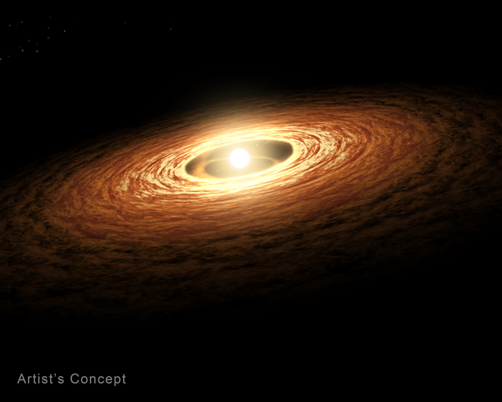 Denne kunstneriske fremstillingen viser en ung stjerne med sin protoplanetariske skive. Det er i slike skiver planeter dannes.