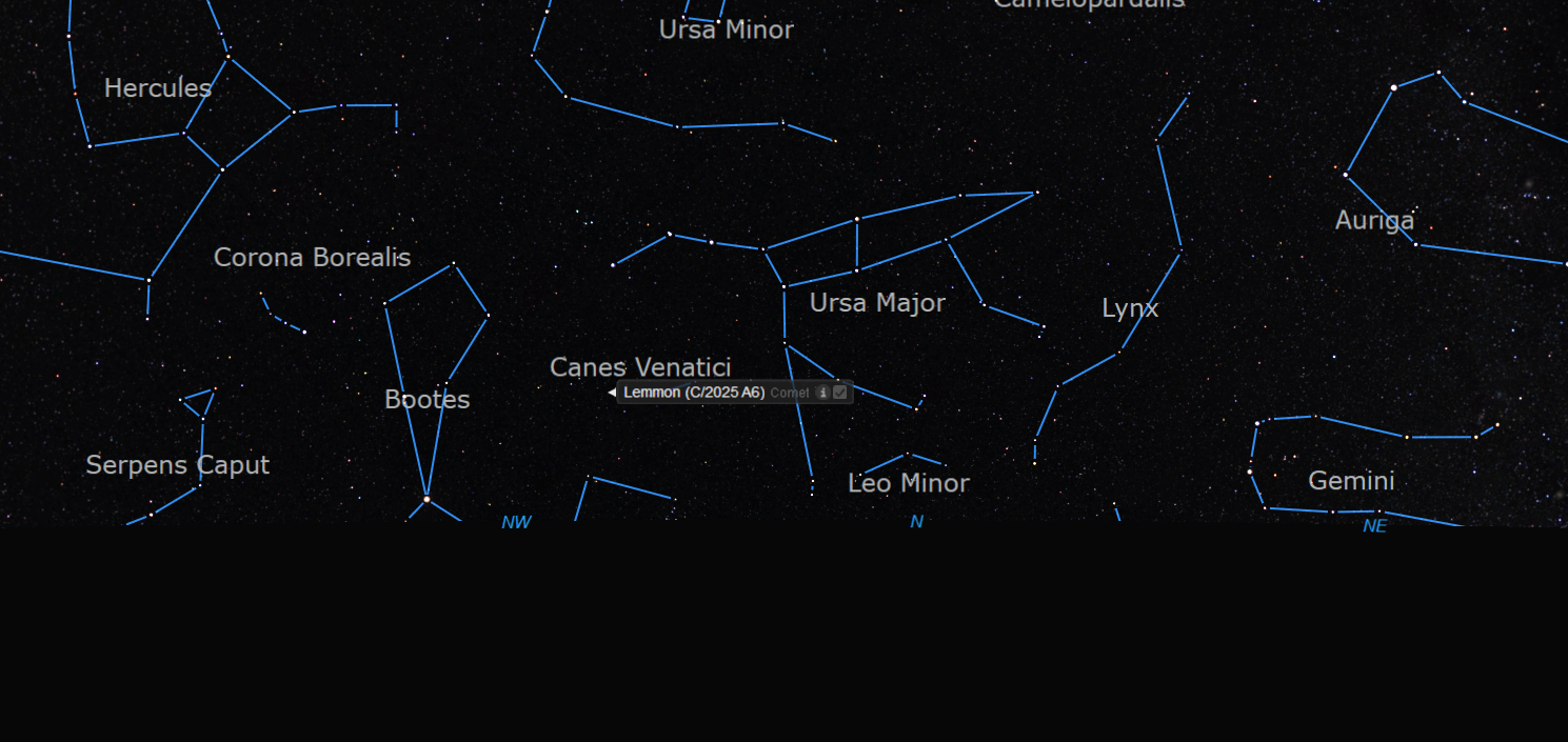 Høstens store komet-overraskelse heter C/2025 A6 (Lemmon) og ble oppdaget med Mount Lemmon Survey (del av Catalina Sky Survey) på bilder tatt 3. januar for å lete etter asteroider og kometer som kan komme nær Jorden. Kometen var da svært lyssvak og hadde en baneperiode på 1350 år, noe som betyr at forrige tur til det indre av Solsystemet fant sted noe før vikingtiden. Under årets besøk endres banen noe av tyngdekreftene fra planetene slik at vi «allerede» om 1150 år kan vente et nytt besøk av komet Lemmon.