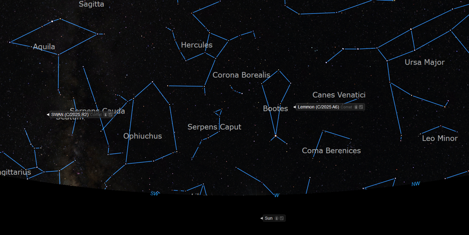 Mens Lemmon står på vesthimmelen på kvelden, befinner SWAN seg lavt på sydvesthimmelen, og de er faktisk ikke så voldsomt langt fra hverandre på himmelen. SWAN vil i løpet av de kommende dagene gradvis komme noe høyere på himmelen samtidig som den beveger seg noe mot syd.